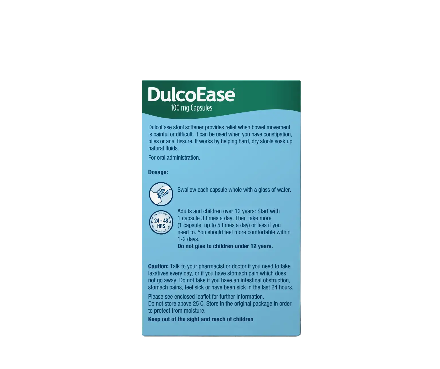 DulcoEase® Capsules provides softening relief from painful, hard, dry stools in 1 to 2 days , making it more comfortable to go.