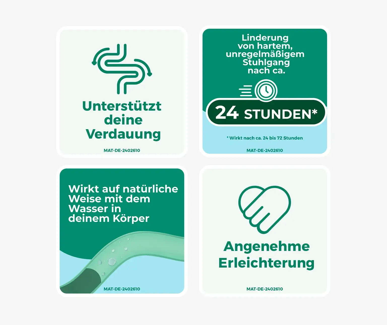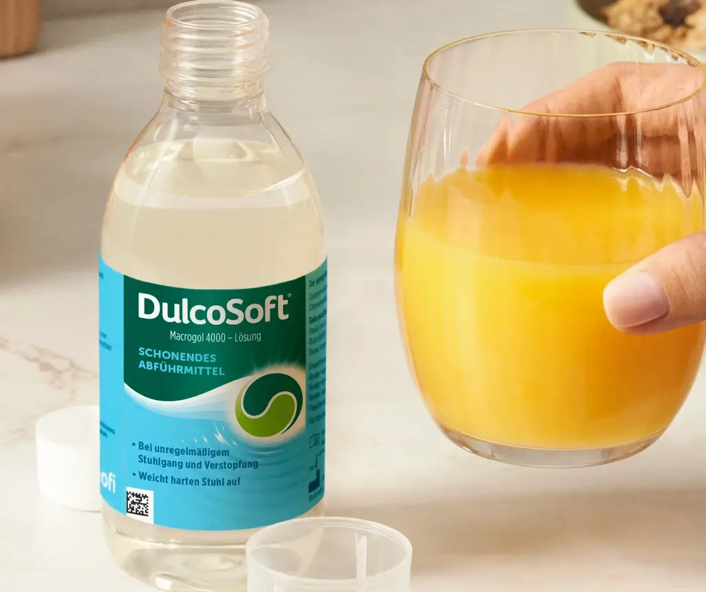 DulcoSoft®, on the other hand, binds water in the intestine, almost like a sponge. This increases the water content in the stool and softens its consistency. It also increases stool volume, stretches the intestinal wall, and stimulates the natural motility of the bowel. In this way, DulcoSoft® gently contributes to more regular relief.