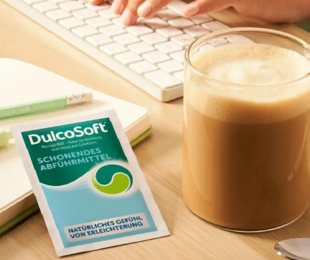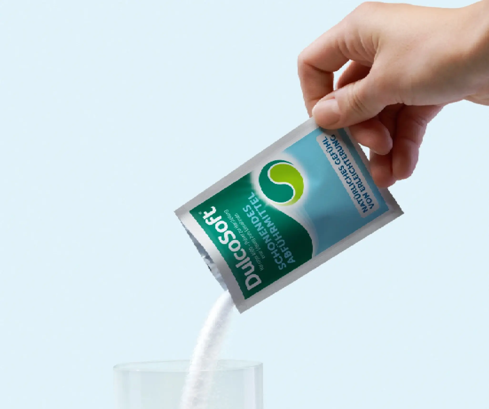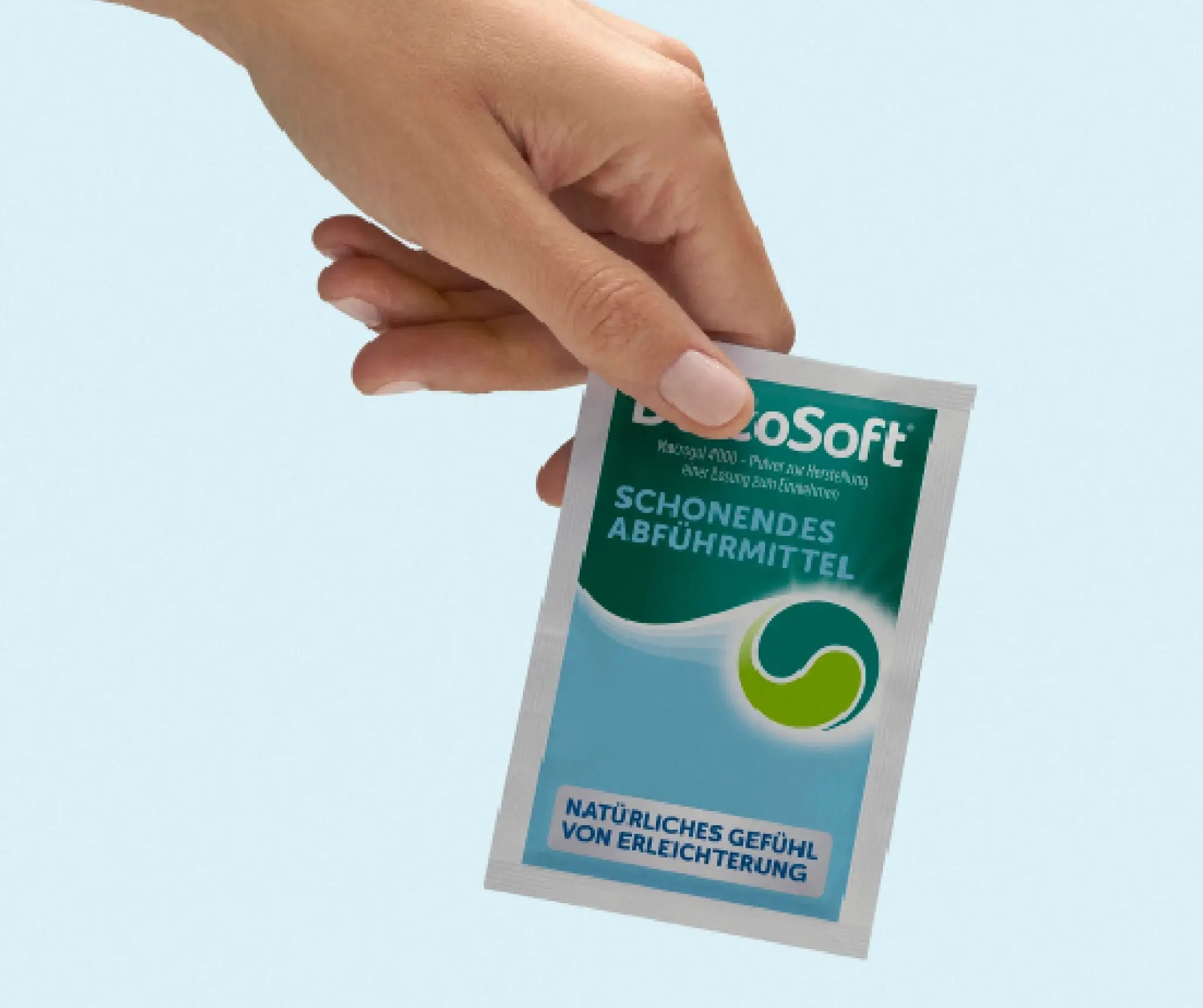 DulcoSoft®, on the other hand, binds water in the intestine, almost like a sponge. This increases the water content in the stool and softens its consistency. It also increases stool volume, stretches the intestinal wall, and stimulates the natural motility of the bowel. In this way,